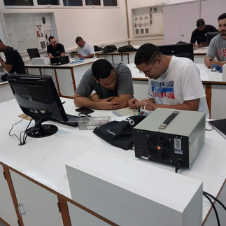 Alunos do Curso Técnico em Mecatrônica, dos períodos vespertino e noturno, participam de aulas de eletrônica em um dos laboratórios do COTIP/FUMEP, permitindo que apliquem os conceitos ensinados em sala de aula na prática e adquiram habilidades essenciais para a área de mecatrônica.
