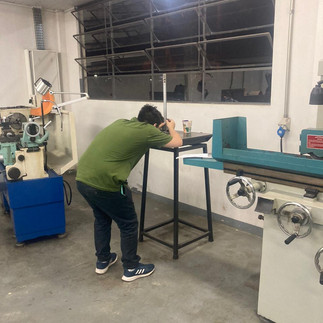 Alunos do último semestre do Curso Técnico em Mecânica em aula prática no laboratório de Processos de Fabricação do COTIP/FUMEP operando tornos, fresadora, retífica, furadeira de bancada e demais ferramentas manuais.